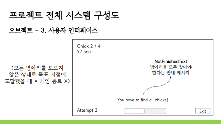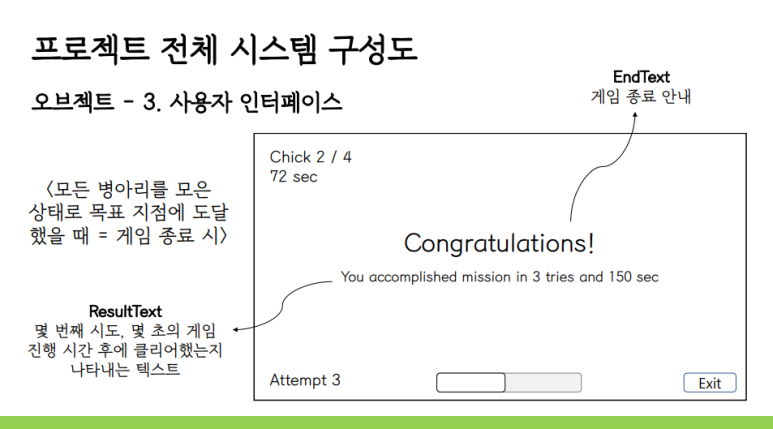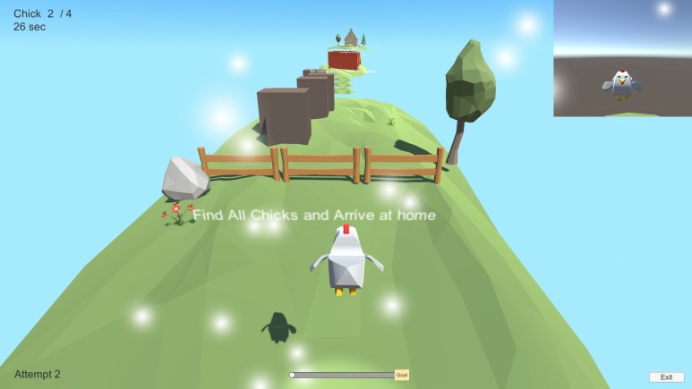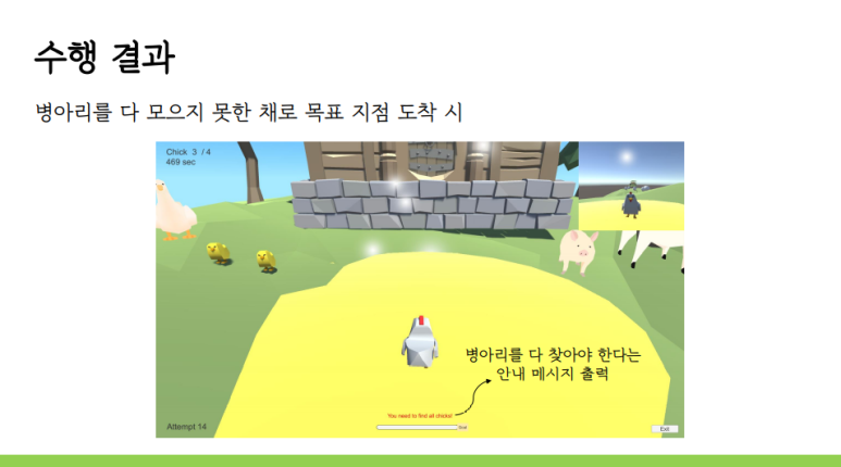 게임 시작과 동시에 타이머가 시작하고 필드에 있는 병아리를 모두 모은 후 목표 지점에 도달하면 게임이 끝난다.