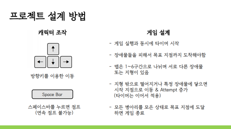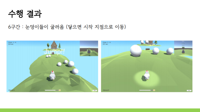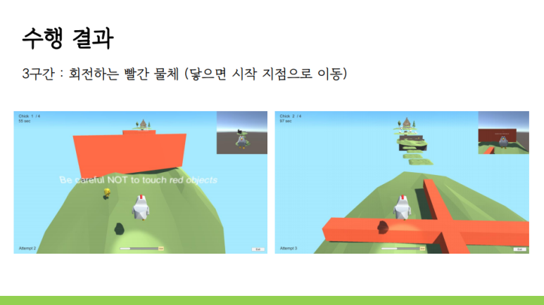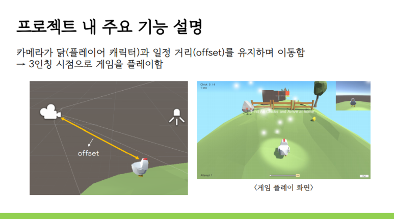 - 닭이 모든 병아리를 모아서 목표 지점에 도착하는 러닝 게임을 제작함