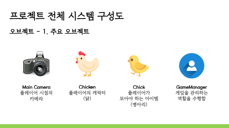 주요 오브젝트는 플레이어의 캐릭터인 닭, 플레이어가 모아야하는 아이템 병아리,